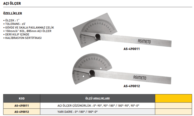 Asimeto Açılı Gönye Yarı Daire Plakalı 85x150mm Özellikler • Ölçek : 1˚ • Tolerans : ±5’ • Gövde Ve Skala Paslanmaz Çelik • 150mm/6” Kol, Ø85mm Açı Ölçer • Deri Kılıf İçinde • Kalibrasyon Sertifikası