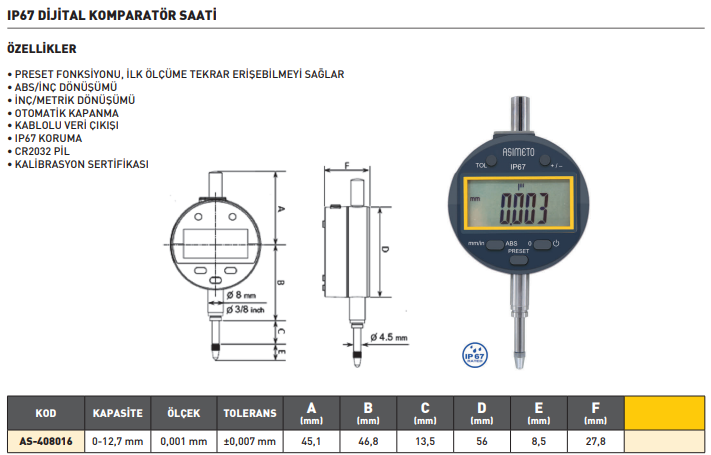 Asimeto Dijital Komparatör Saati IP67 0-12.7mmx0.001 0-12.7mmx0.001 Ip67 Özellikler • Preset Fonksiyonu, İlk Ölçüme Tekrar Erişebilmeyi Sağlar • Abs/inç Dönüşümü • İnç/metrik Dönüşümü • Otomatik Kapanma • Kablolu Veri Çıkışı • Ip67 Koruma • Cr2032 Pil • Kalibrasyon Sertifikası