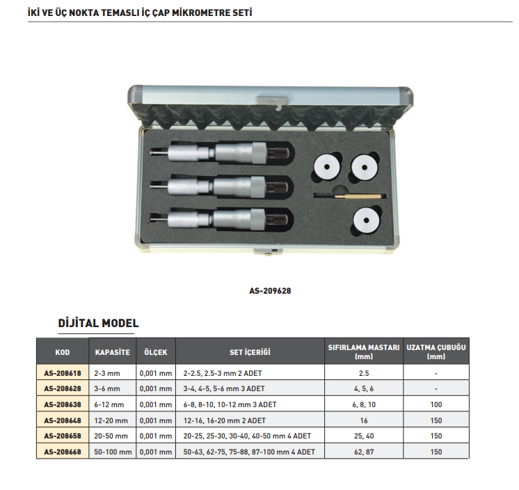 Asimeto İki Ve Üç Nokta Temaslı İç Çap Mikrometre Seti Dijital 50-100mm | AS-208668