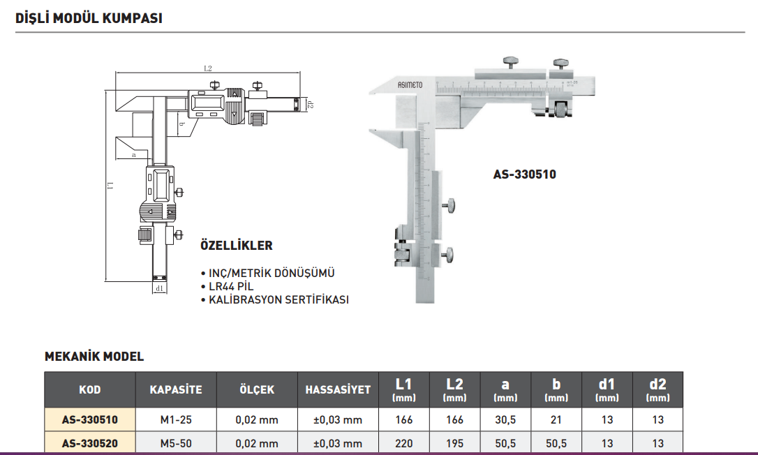 Asimeto Mekanik Dişli Modül Kumpası M5–50mm, geniş modül aralığıyla dişli ölçüm işlemlerini yüksek hassasiyetle gerçekleştirir. M5 ile M50 arasında ölçüm yapabilen bu kumpas, 0,02 mm ölçek hassasiyetiyle detaylı ve güvenilir sonuçlar sunar.