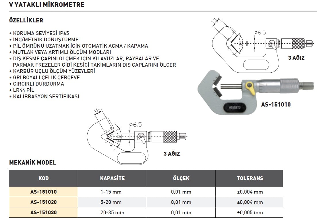 Asimeto Mekanik V Yataklı Mikrometre 5-20mm | AS-151020