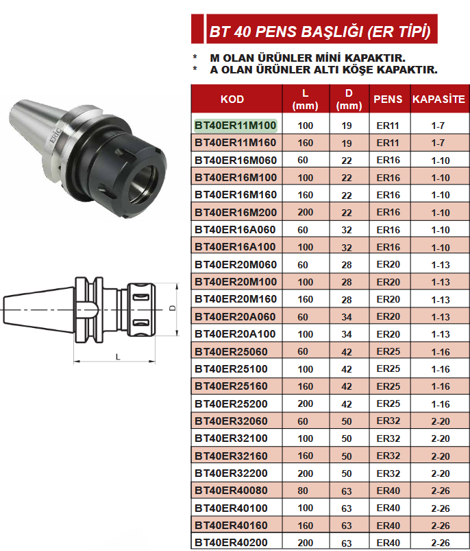 BT 40 ER16 200mm Mini Kapaklı Pens Başlığı Eric