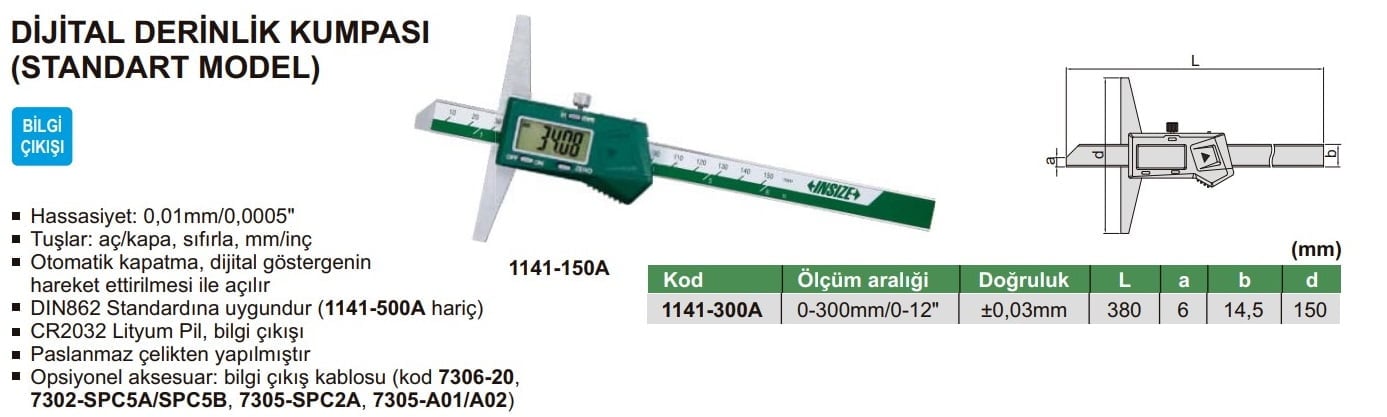 INSIZE 1141-300A Dijital Derinlik Kumpası 300 mm (Standart Model)