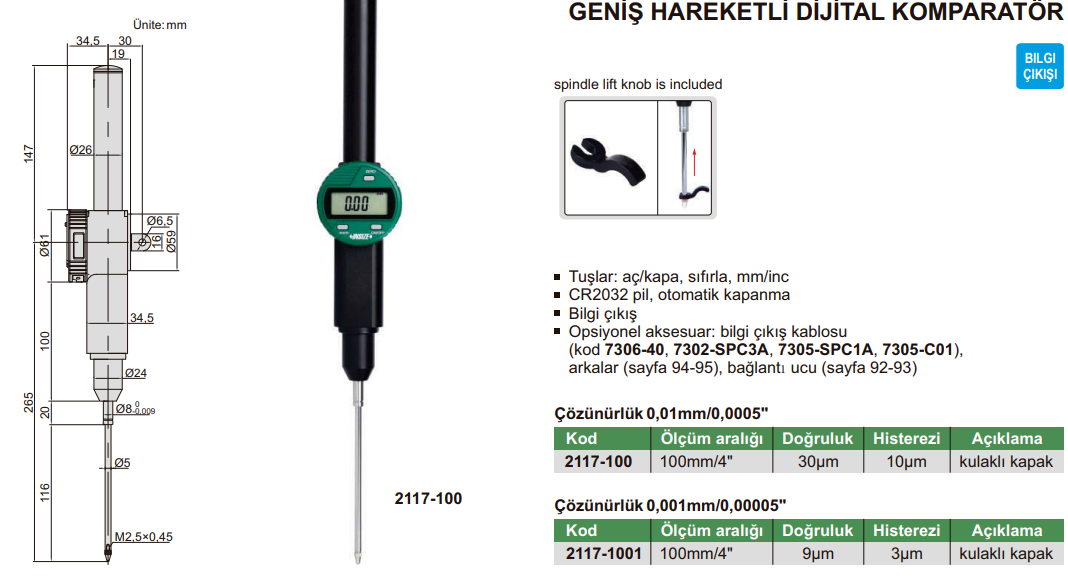 Dijital Komparatör Saati, Kulaklı Kapaklı – Uzun Çalışma Mesafeli Ölçü: 100mm/4″ Hassasiyet: 0.001mm/0.00005″