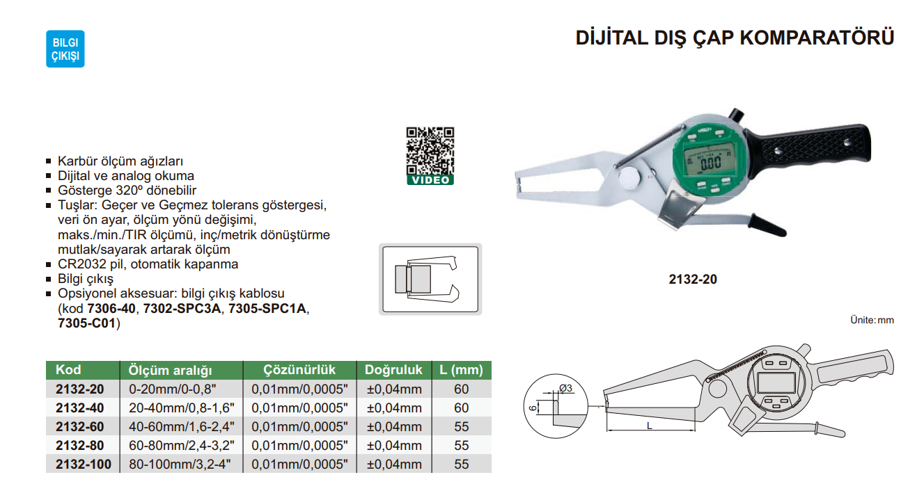 INSIZE 2132 20-40 mm Dijital Dış Çap Komparatörü Dijital Dış Çap Komparatörü Ölçü: 20-40mm Hassasiyet: 0,01mm