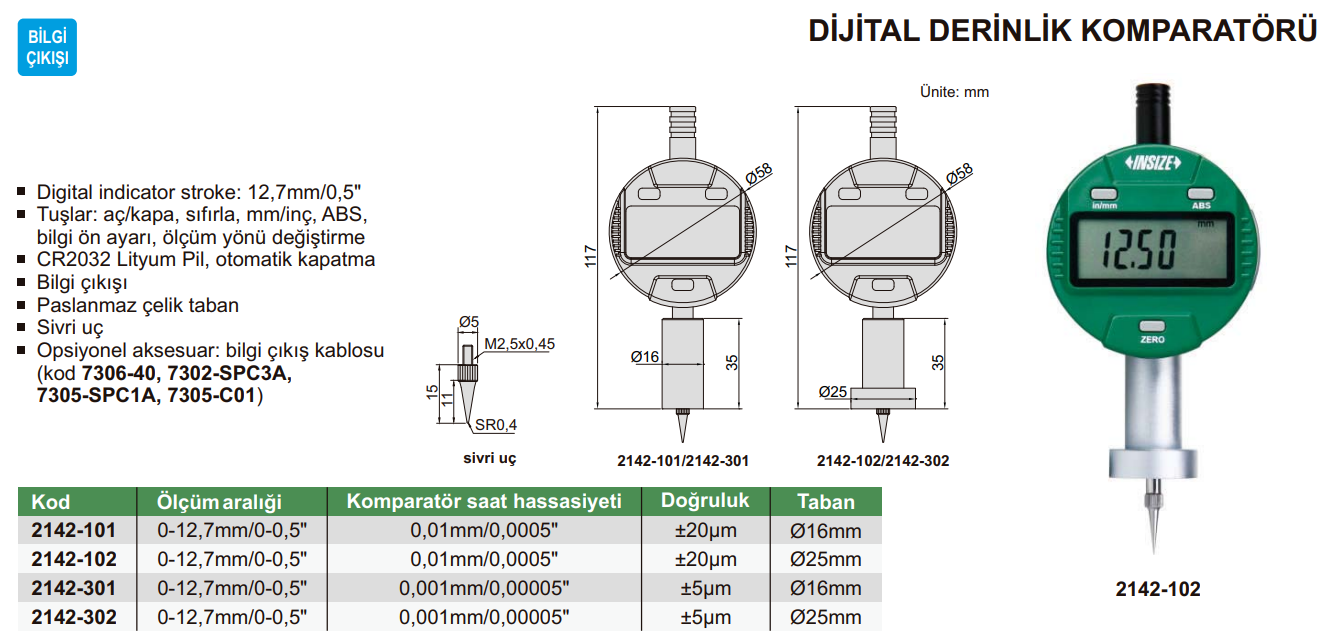 Dijtal Derinlik Komparatörü (taban Φ25mm) Ölçü: 0-12.7mm/0-0.5″ Hassasiyet: 0.01mm/0.0005″