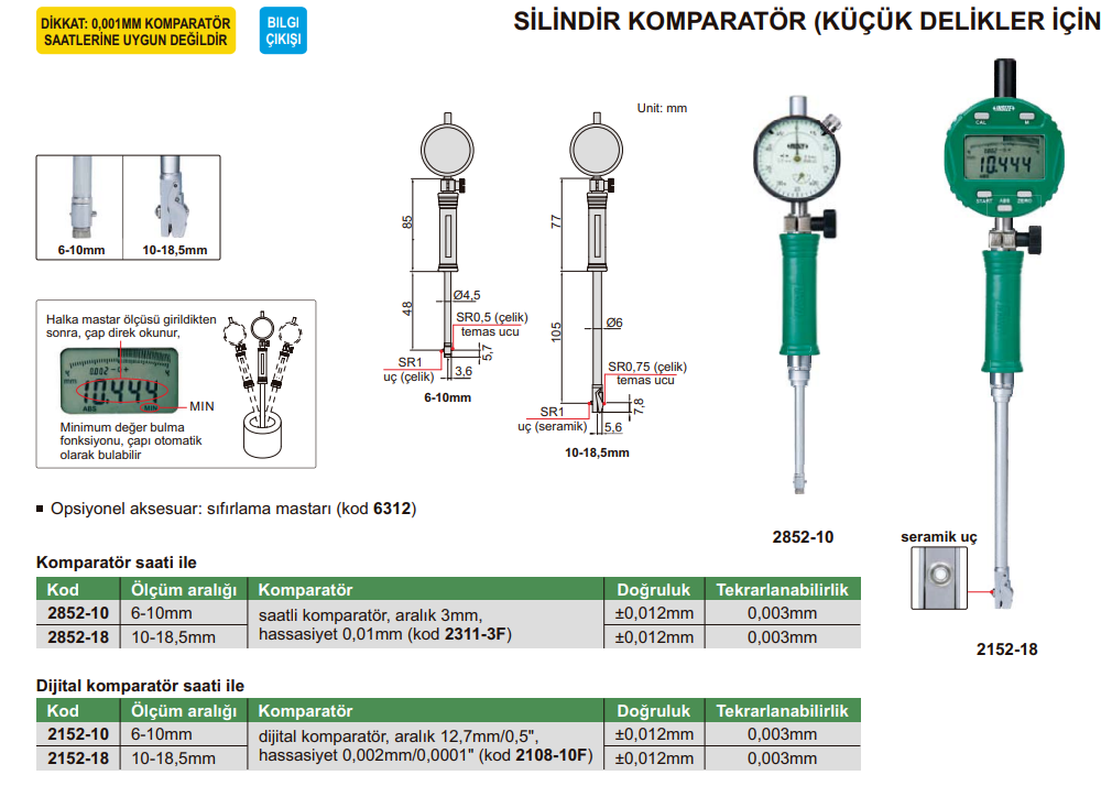 Dijital Silindir Komparatörü Ölçü: 6-10mm Hassasiyet: 0,002mm