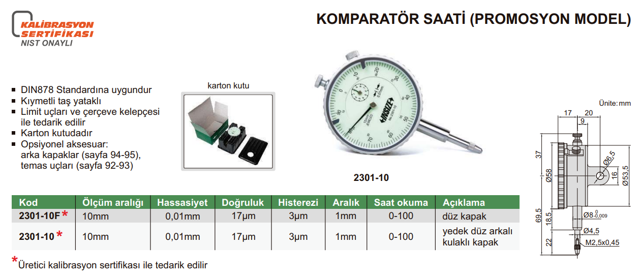Komparatör Saati Ekonomik Model (Düz Kapak) Ölçü: 0-10mm Hassasiyet: 0.01mm