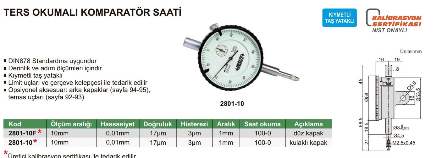 INSIZE 2801 Ters Okumalı Komparatör Saati