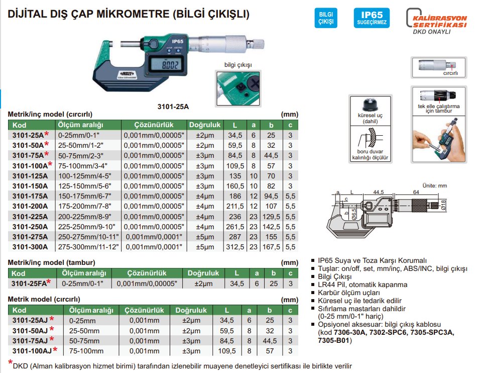 - Tuşlar: on/off,set,mm/inç,ABS/INC,bilgi çıkışı
