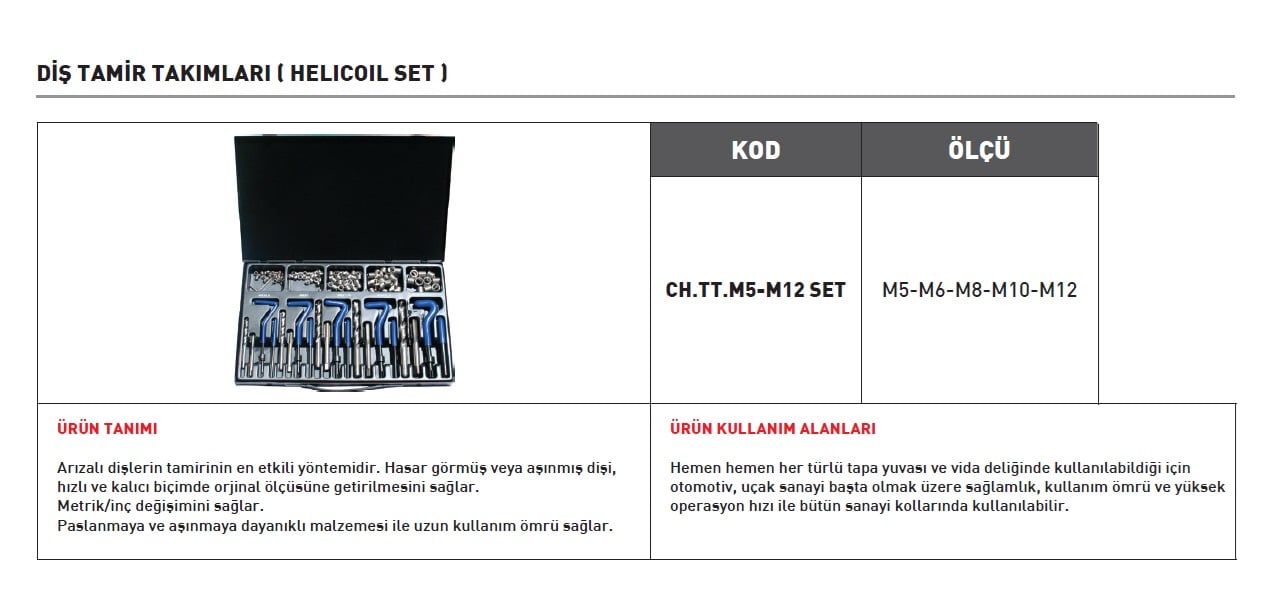 Otomotivden makine imalatına, beyaz eşya bakımından atölye uygulamalarına kadar birçok alanda bu setle etkili sonuçlar alırsınız. Yüksek mukavemetli paslanmaz çelikten üretilen Helicoil diş yayları, onarılan dişleri orijinalinden daha sağlam hale getirir. Böylece bağlantı noktalarında güvenlik ve dayanıklılığı garanti edersiniz.