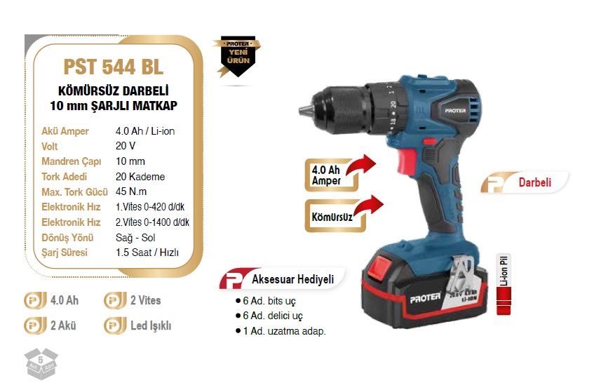 PROTER Kömürsüz Darbeli 10 mm Şarjlı Matkap PST 544 BL