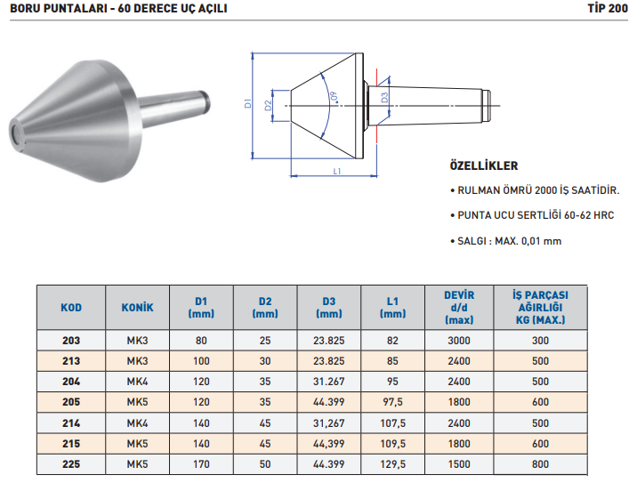 Ürün 60 derece uç açısı ile parçaları doğru şekilde merkezler. Kullanıcı iş parçasını güvenle sabitler ve işleme kalitesini yükseltir. MK3x100 bağlantı yapısı farklı torna tezgâhlarıyla uyum sağlar. Bununla birlikte sağlam gövde yapısı uzun ömürlü kullanım avantajı sunar.