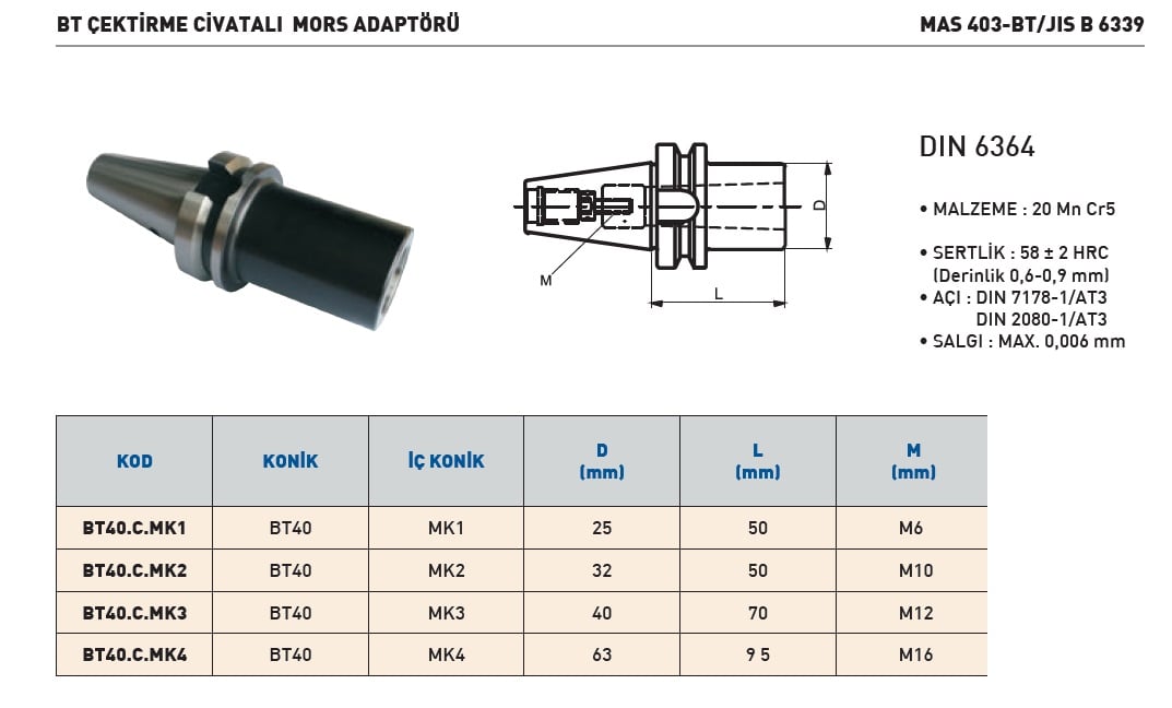 Sonuç olarak TEMAK BT40.C.MK3 Çektirme Civatalı Mors Adaptörü, dayanıklı yapısı, hassas üretimi ve uyumlu ölçüleriyle profesyonel üretim ortamları için en doğru tercihtir.