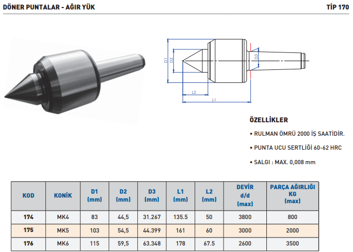 Döner puntalar, iş parçasını sabitlemek ve işlem sırasında desteklemek için kullanılır. TEMAK MK5 ağır yük punta, yüksek yük kapasitesi sayesinde büyük ve ağır parçaları güvenle taşır. Kullanıcı bu model ile titreşimsiz ve dengeli işleme yapar. Sağlam rulman sistemi, uzun süreli kullanımlarda bile hassasiyet sağlar.