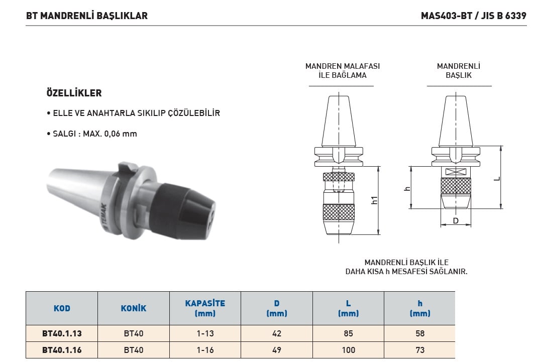 Sanayi atölyeleri, TEMAK BT40.1.13 Mandrenli Başlık ile frezeleme, delme ve kesme işlemlerinde üstün hassasiyet elde eder. BT40 standardı, ürünün birçok CNC tezgâhla uyumlu çalışmasına olanak tanır. Mandrenli yapı, takım uçlarını güvenli şekilde sabitler. Bu özellik hem iş güvenliğini hem de üretim hızını artırır. Kullanıcılar, yoğun iş temposunda bile kesintisiz çalışır.